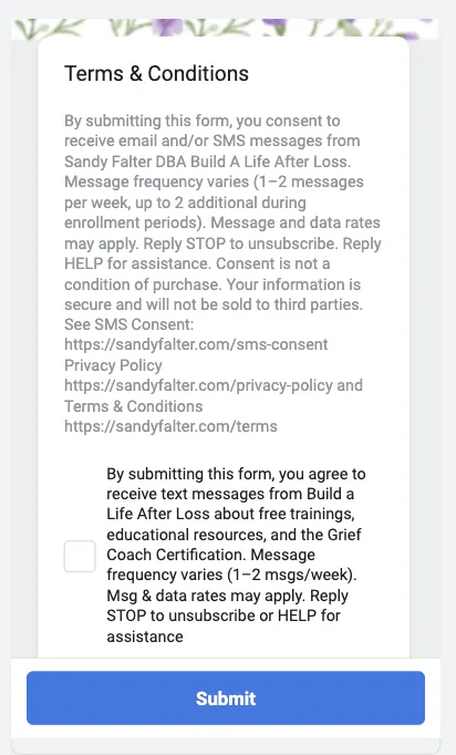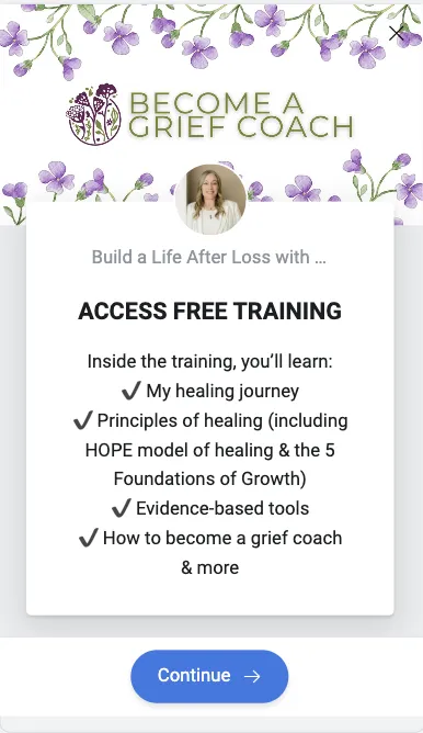 “By submitting this form, you agree to receive text messages from Build a Life After Loss about free trainings, educational resources, and the Grief Coach Certification. Message frequency varies (1–2 msgs/week). Msg & data rates may apply. Reply STOP to unsubscribe or HELP for assistance.”