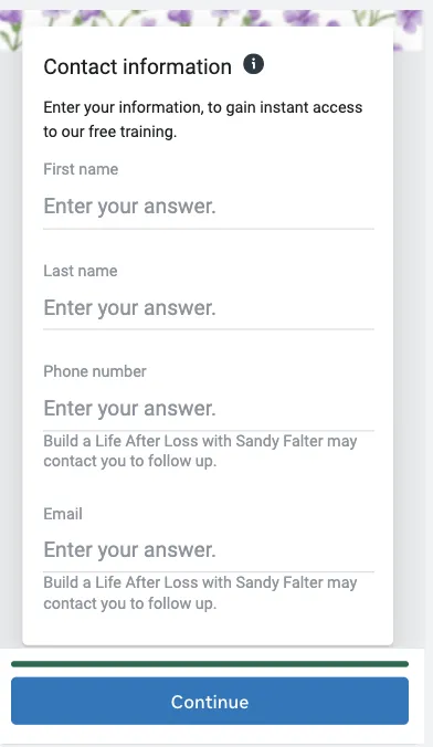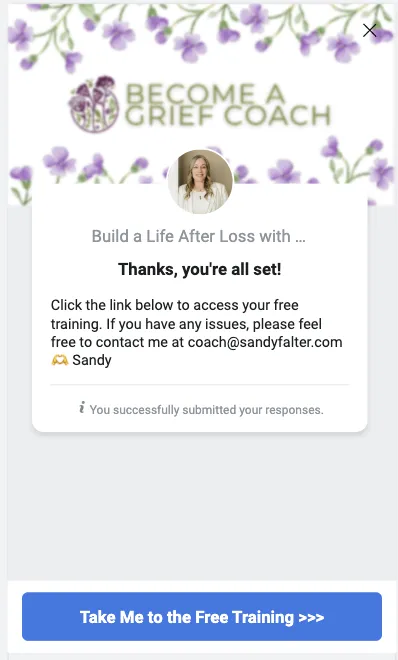 Individuals opt in by submitting a Meta (Facebook & Instagram) lead form requesting information about grief coaching education and the Grief Coach Certification program.